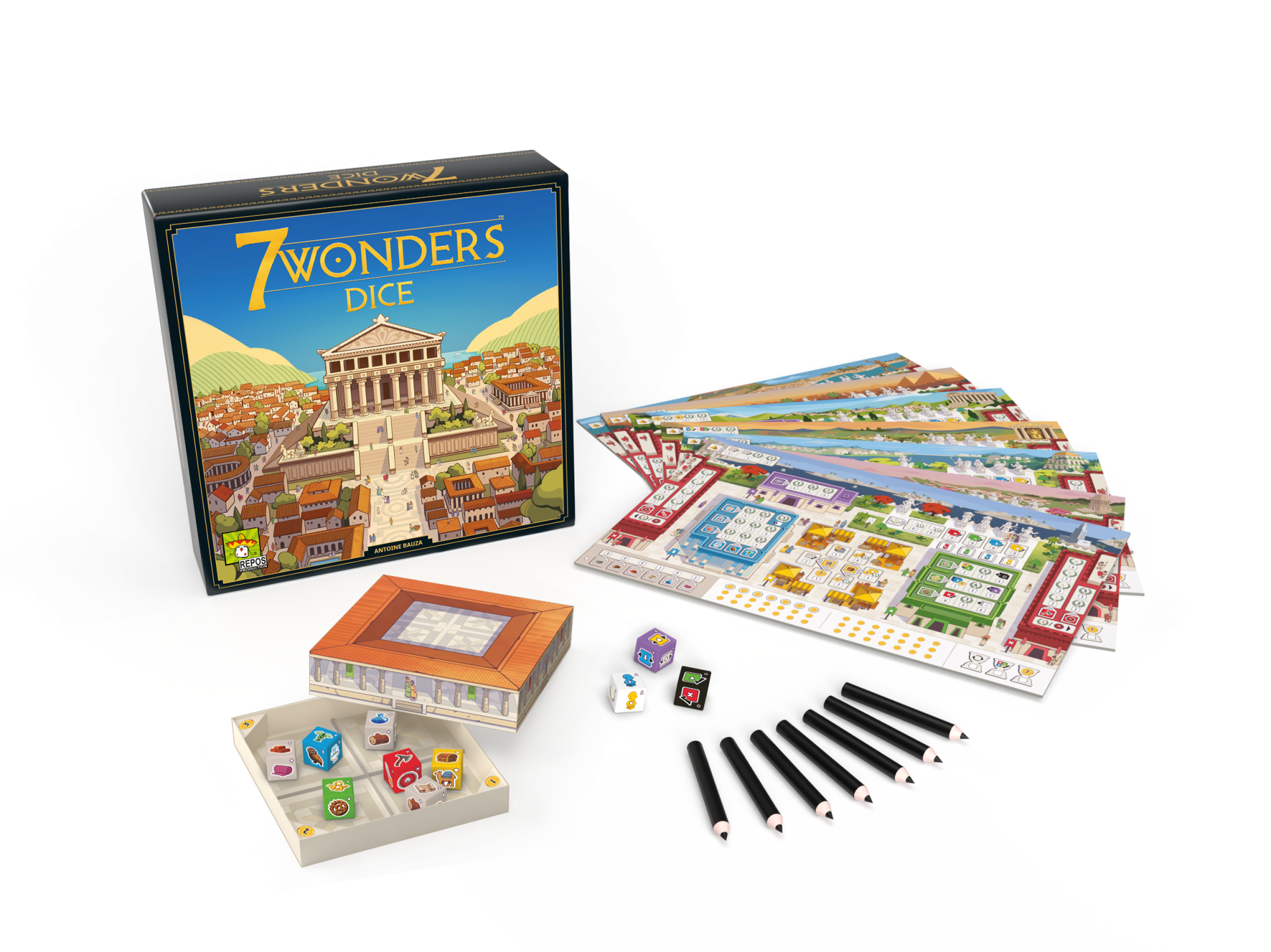 Guide one of the seven largest cities of antiquity to prosperity in 7 Wonders Dice. During the game, you will construct a wonder that defies time, make scientific advances, develop commerce, manage your resources, and handle your gold reserve prudently — all while keeping an eye on neighboring cities since ignoring them has a heavy price!